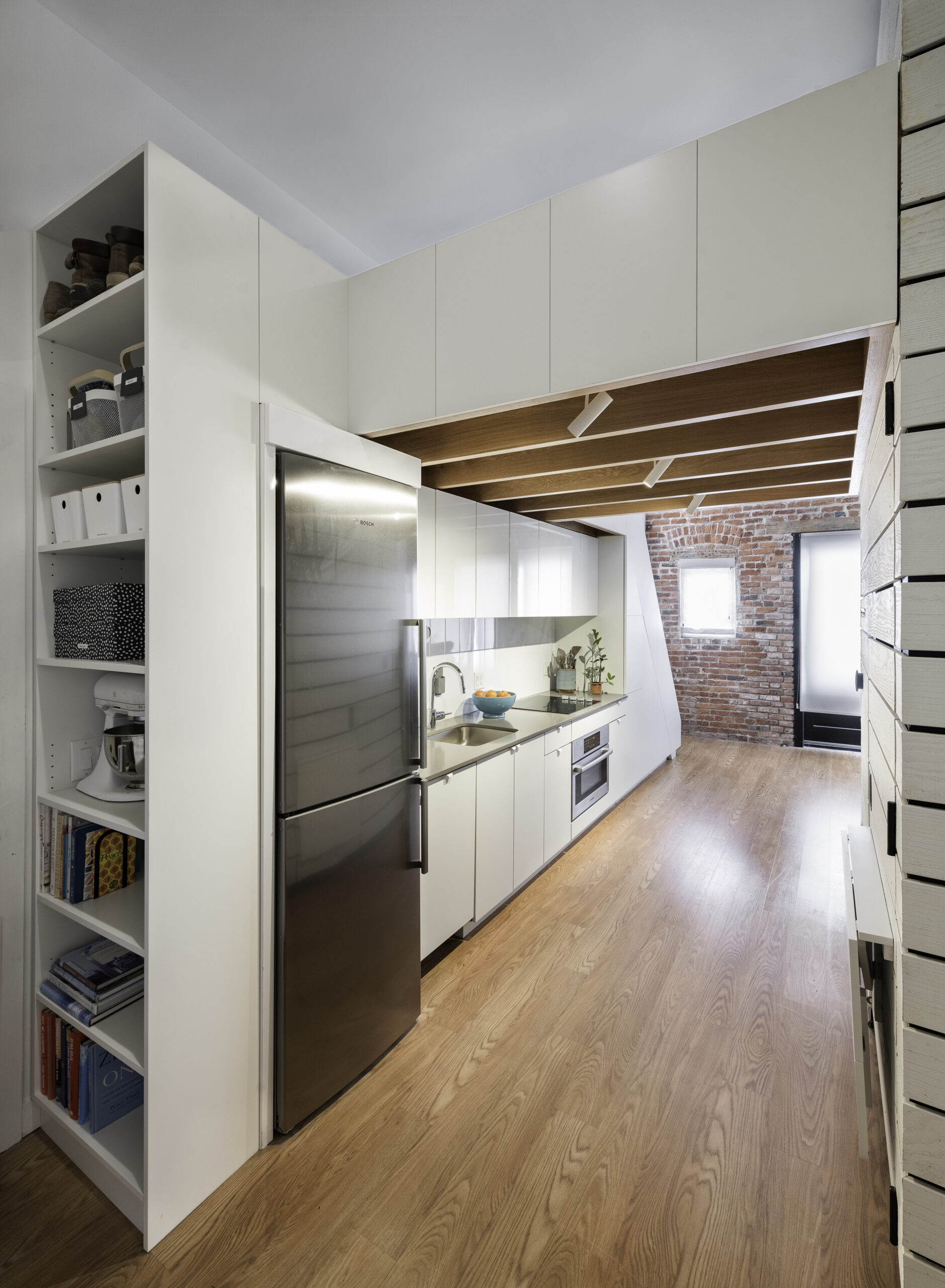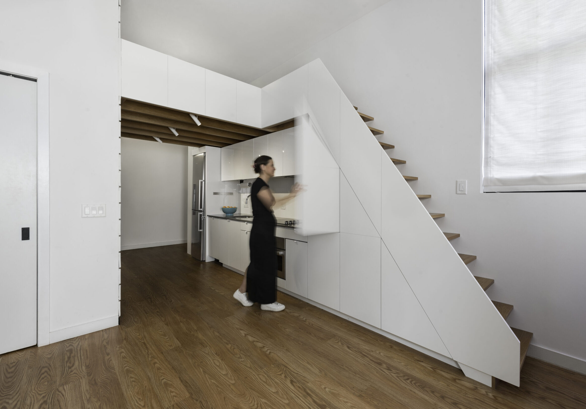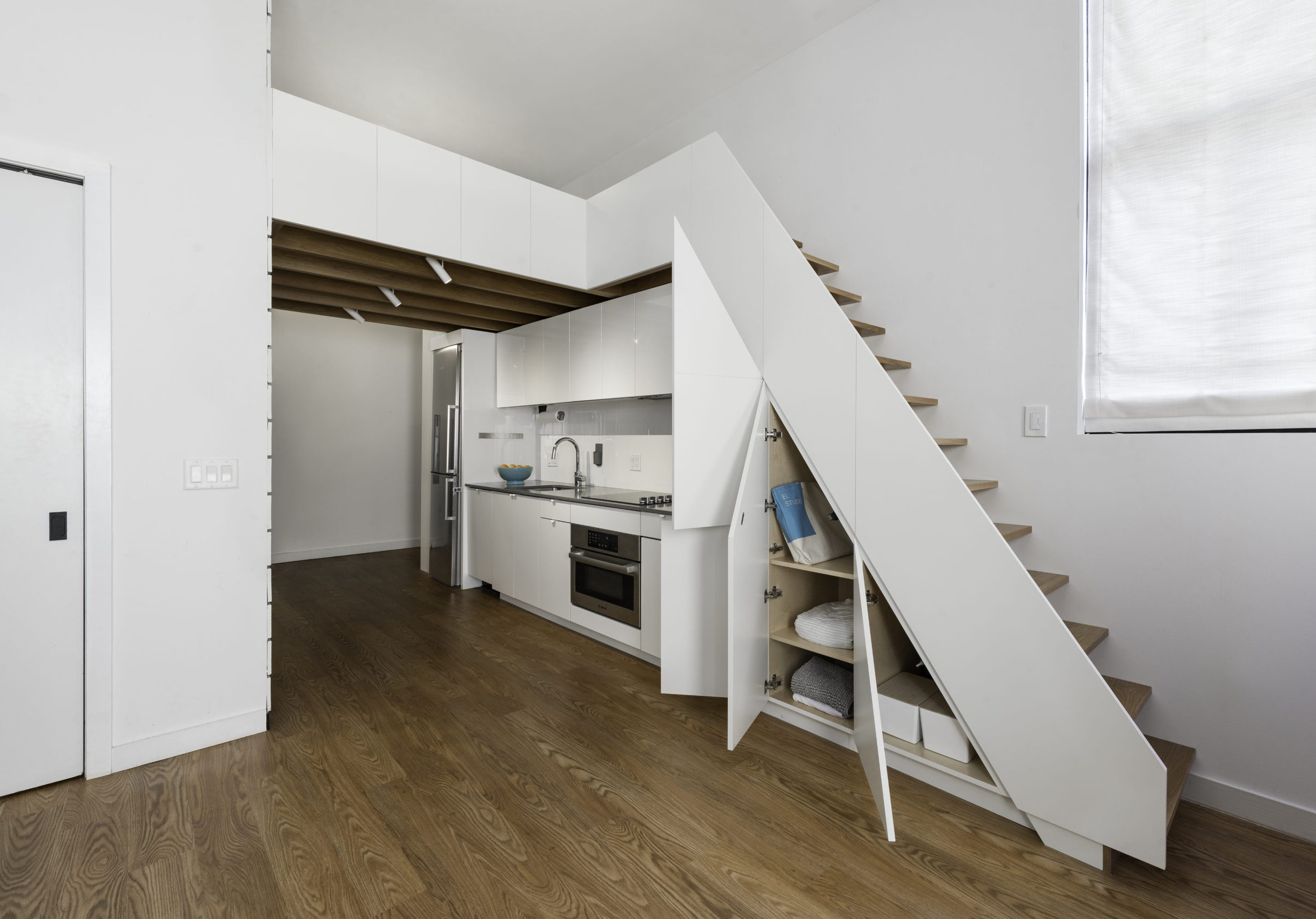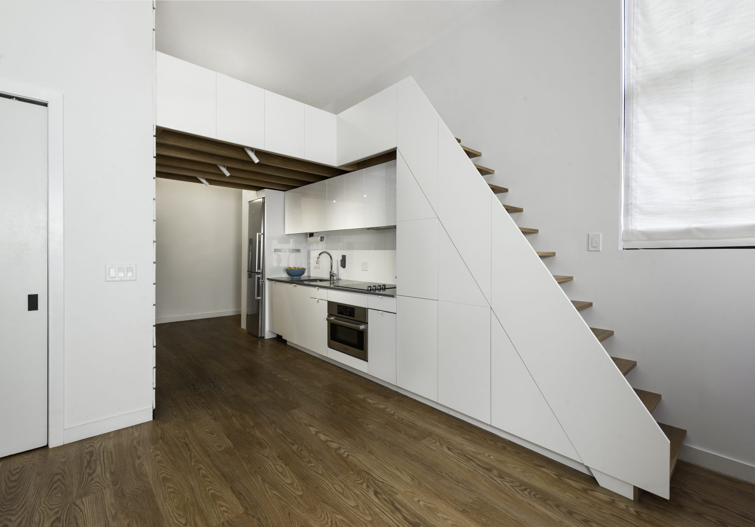 The project called for the design of a lofted space tailored to the needs of a young professional, incorporating a queen bed and integrated storage to a studio apartment in the historic Chapman Stables building.