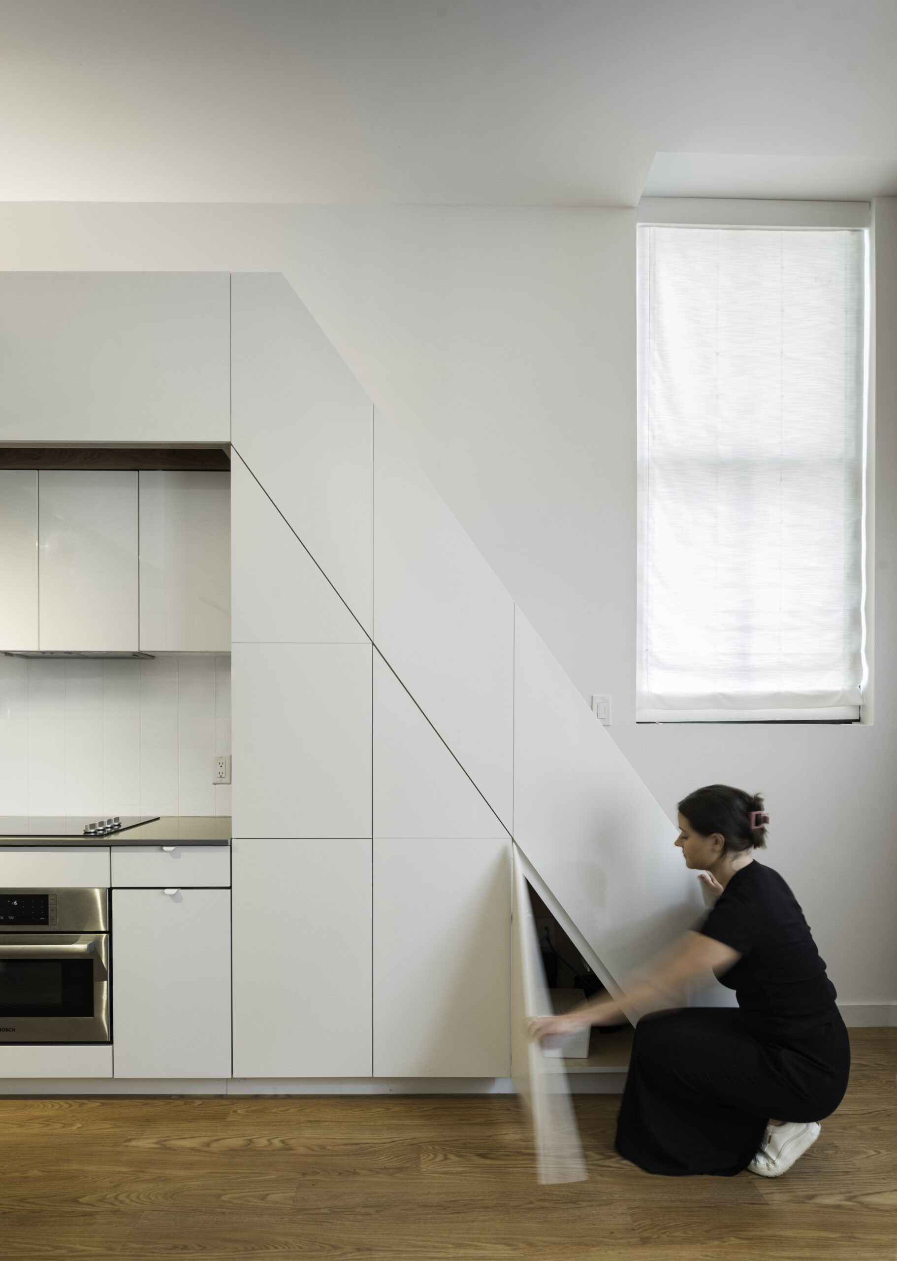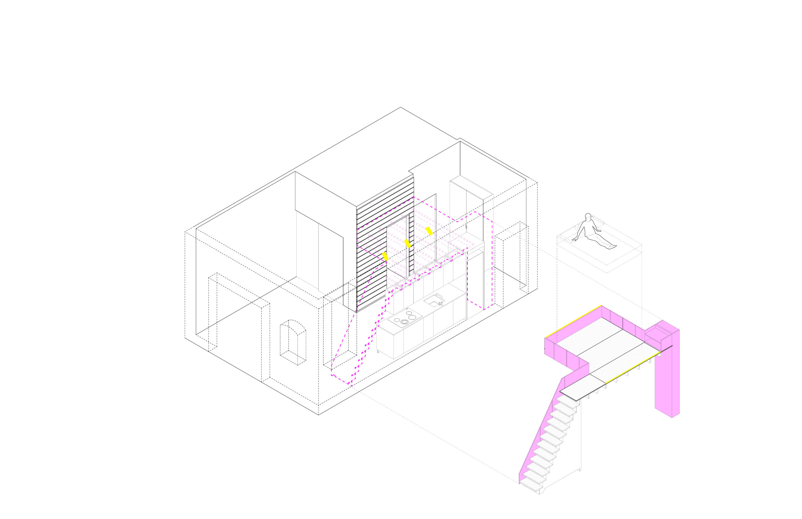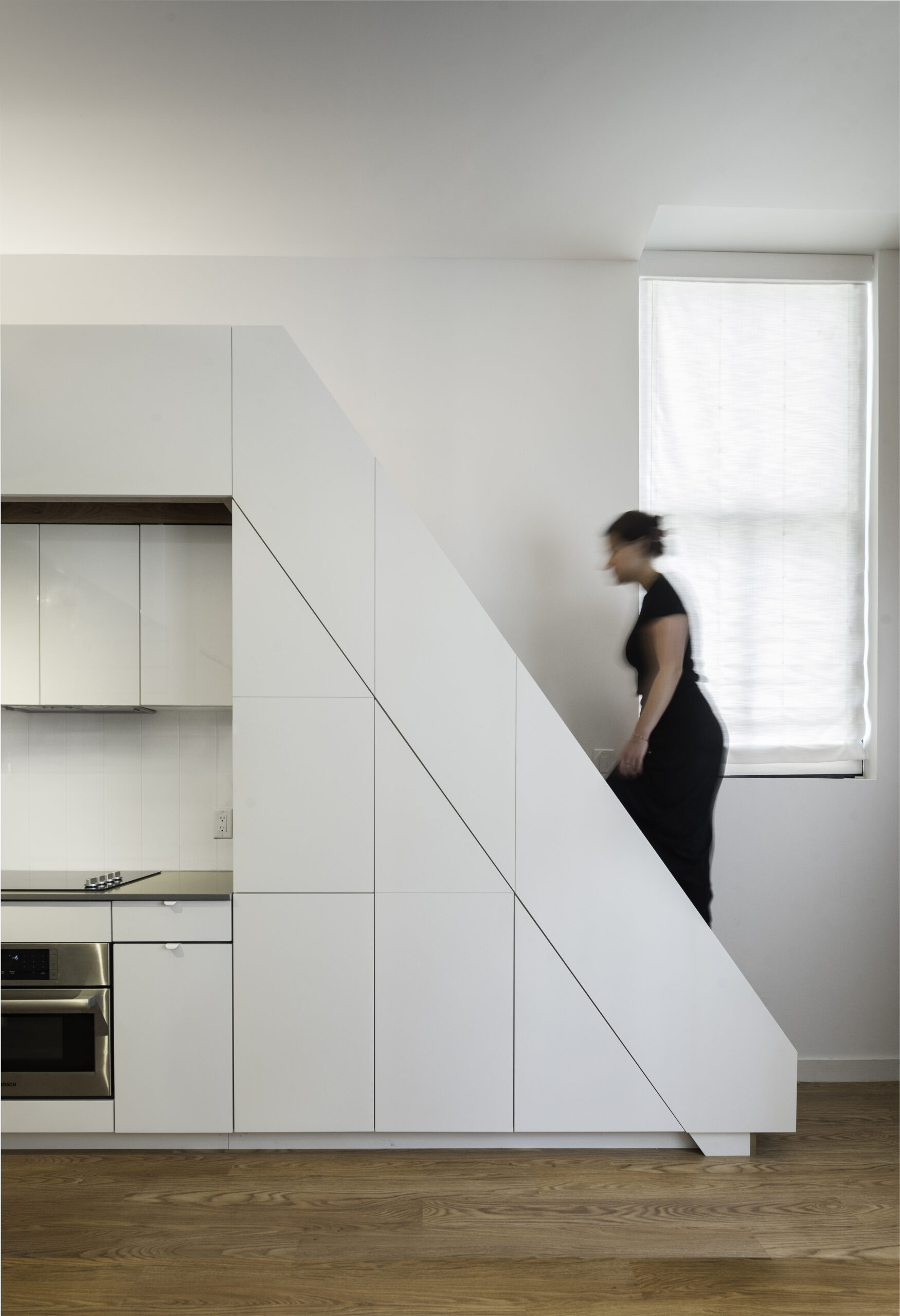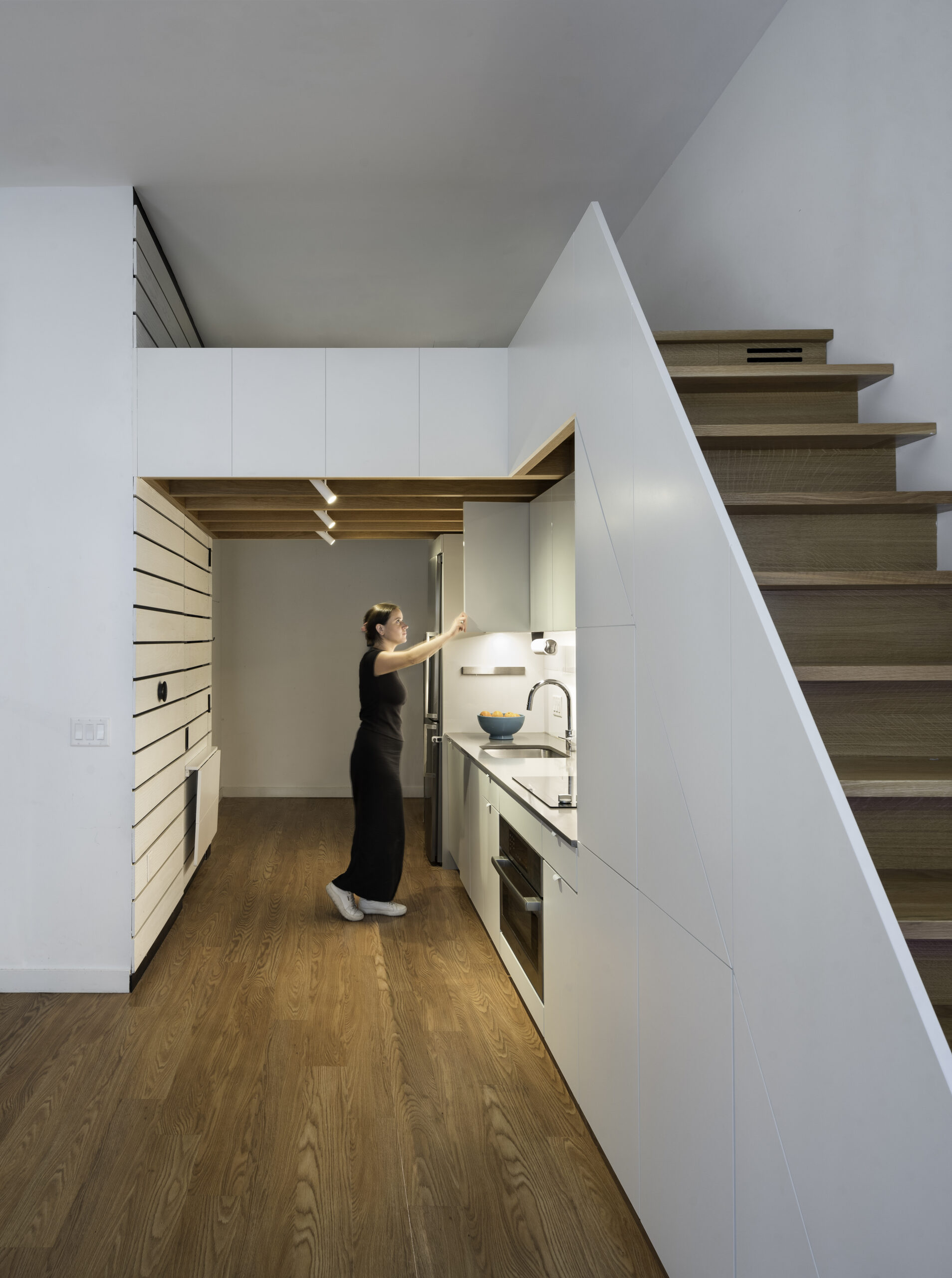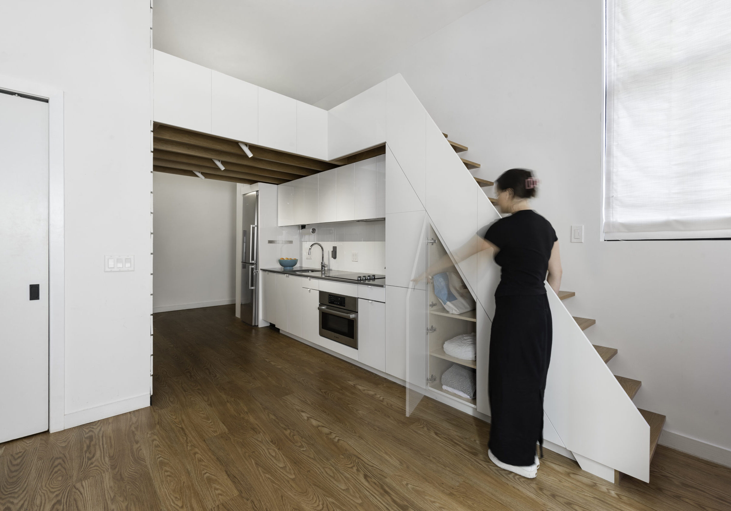 The project called for the design of a lofted space tailored to the needs of a young professional, incorporating a queen bed and integrated storage to a studio apartment in the historic Chapman Stables building.