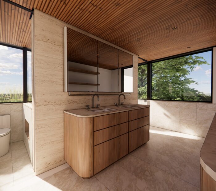 Our design solution centers on flow. By strengthening the connections between interior spaces and the outdoors, the home begins to feel more expansive, cohesive, and intentional. A key component of this transformation is a new primary bath addition, thoughtfully sited atop the home’s existing one-story wing. Elevated above the landscape, this serene retreat will offer panoramic views of the Potomac, turning everyday routines into moments of calm and reflection.